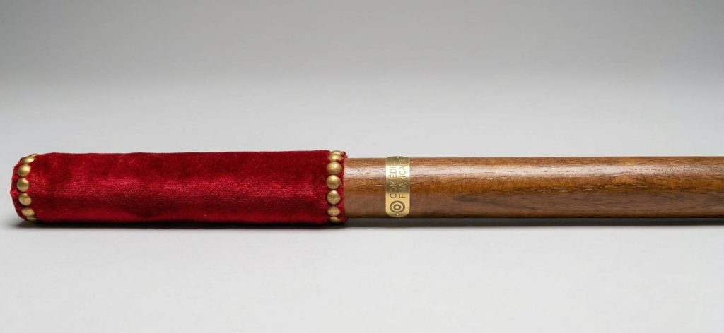 Il s’agit du Brigadier ! Loin d’être une représentation des forces de l’ordre, son nom est tiré du nom ancien du régisseur des salles de spectacle : le brigadier. Sa partie haute est enveloppée de velours rouge et maintenue par des clous de tapissier. Un objet fabriqué artisanalement selon la tradition !